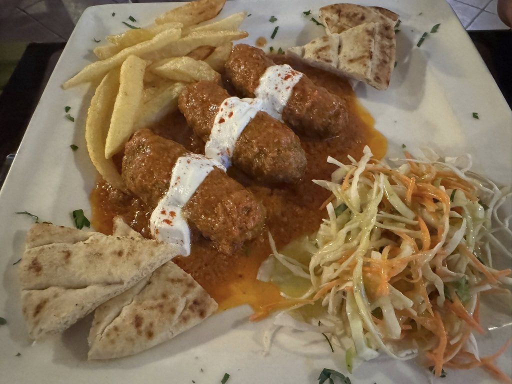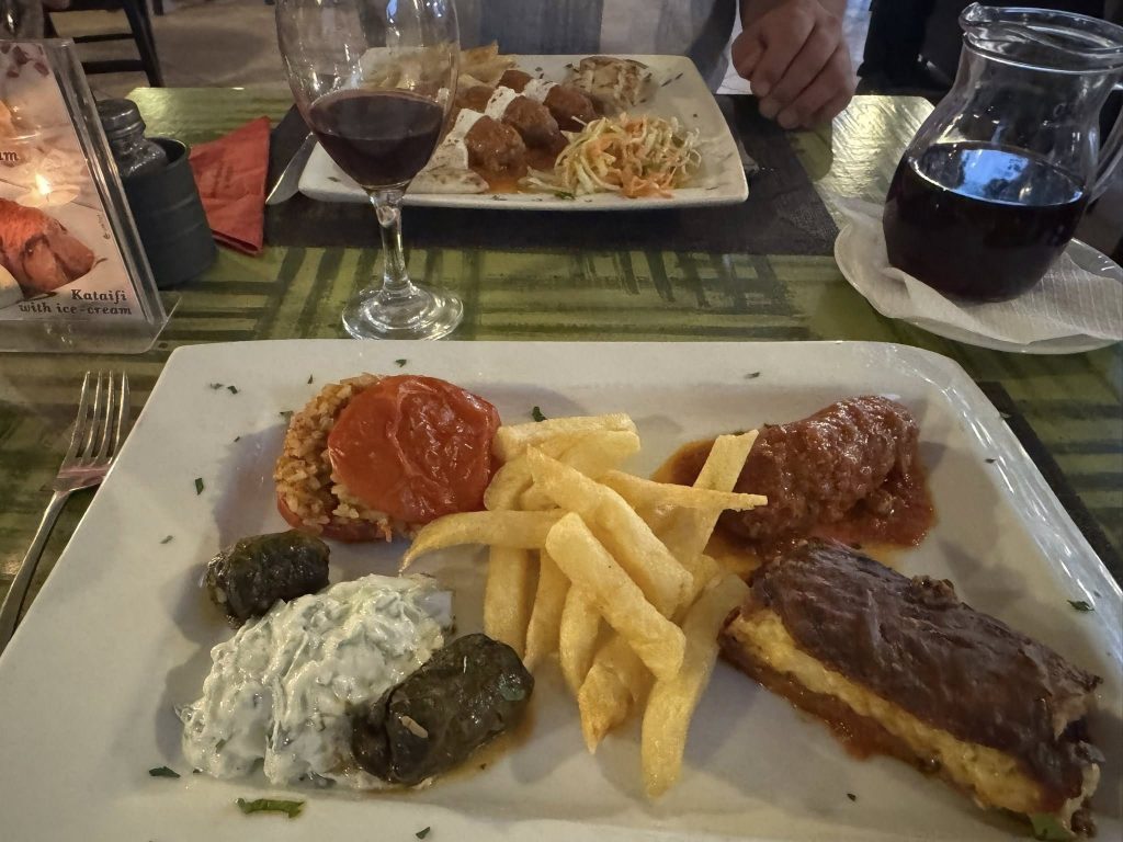 There, I ordered the Cretan Platter—moussaka, dolmades, soutzoukakia, tzatziki, a stuffed tomato—all the hits, a Greek Greatest Bites if you will. But Andy… oh, sweet Andy. He won. He had the house meatballs—pork and beef, seasoned with sumac and stewed in a tomato sauce that I wanted to bottle, bathe in, and write poetry about. I stared at his plate like a cat that’s just realised the dog got steak.