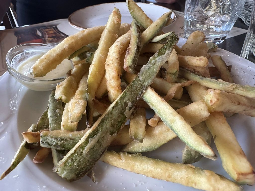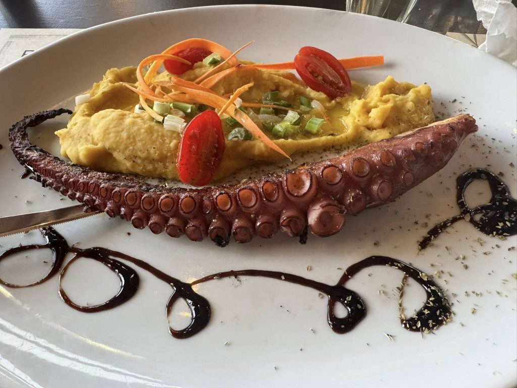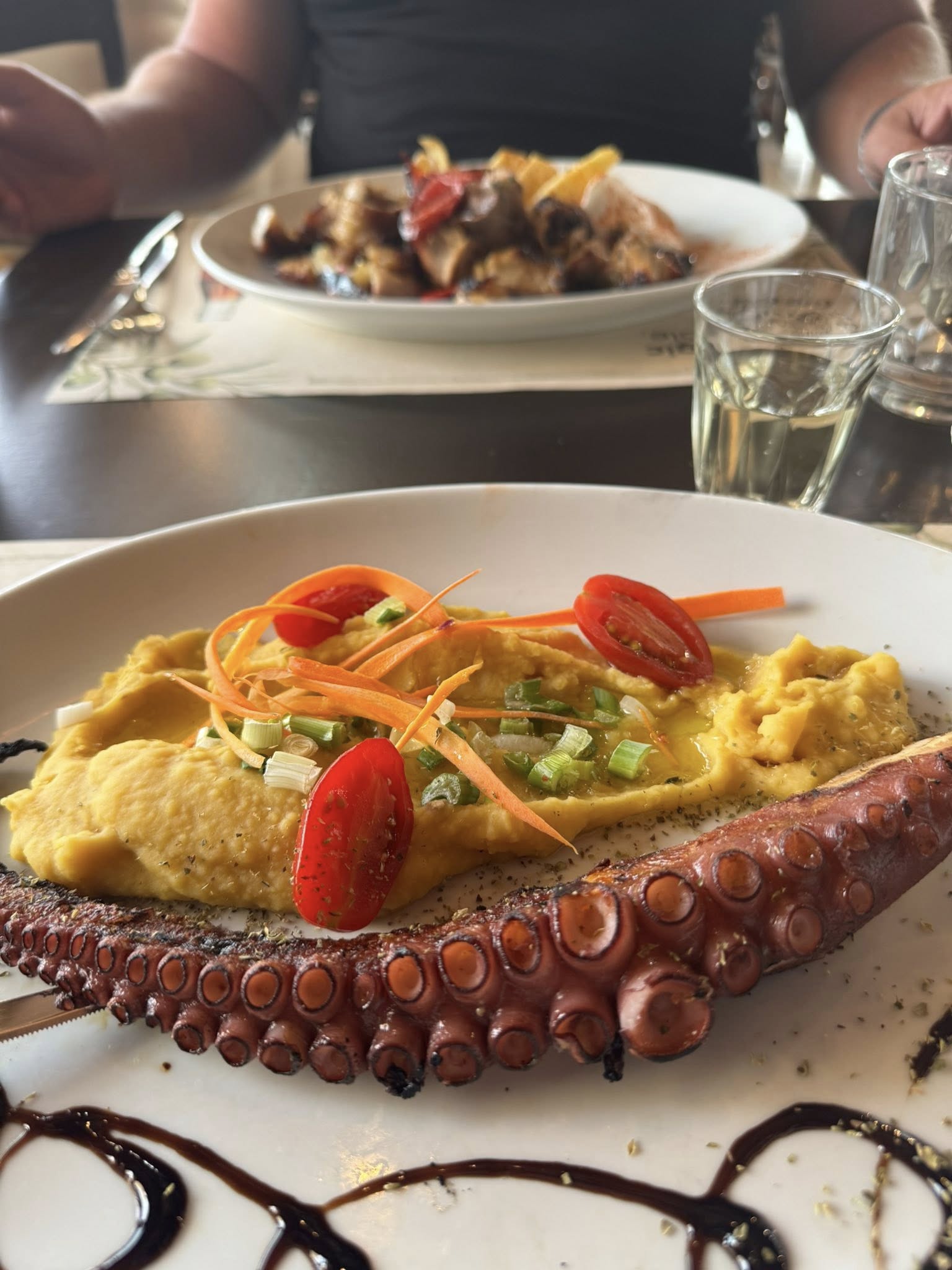 Let’s talk zucchini sticks. Every table had them. I panicked and ordered them like a local trying to blend in at a family wedding. They arrived golden, crisped to perfection, served with a garlic emulsion so potent it might’ve awakened my ancestors. Then came the octopus—because of course it did—laid lovingly on a bed of fava, drizzled in balsamic like Poseidon’s appetizer plate.