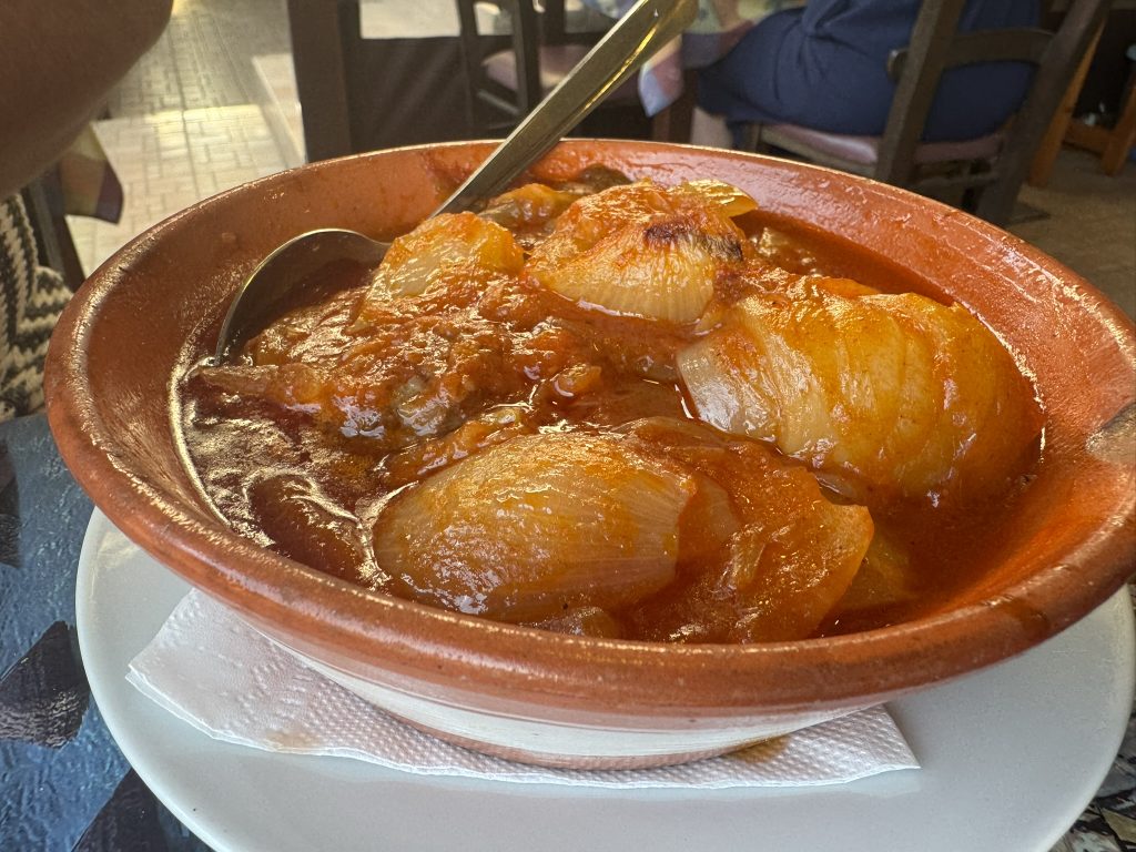 Dinner that night was at Gevsi in Piskopiano, a tucked-away gem that doesn’t scream for attention — because it doesn’t need to. We ordered the stifado meal for two, which turned out to be a full-blown celebration of Cretan comfort food. Picture this: tender beef stifado so rich, so slow-cooked, it barely held together under the fork — like carving into warm butter. Alongside it came generous plates of large white beans swimming in a tomato sauce that tasted like someone’s yiayia had been simmering it since morning. A crisp mixed salad — tomatoes so ripe they should be illegal, crunchy cucumbers, and bitey onions — balanced things out with a cool crunch. Then there were the warm dolmades, little vine-wrapped gifts that melted in your mouth like lemony silk, a bowl of creamy tzatziki with just the right garlicky punch, and slices of garlic bread for unapologetic scooping. It wasn’t just a meal — it was a love letter from Crete, written in olive oil and served with wine.