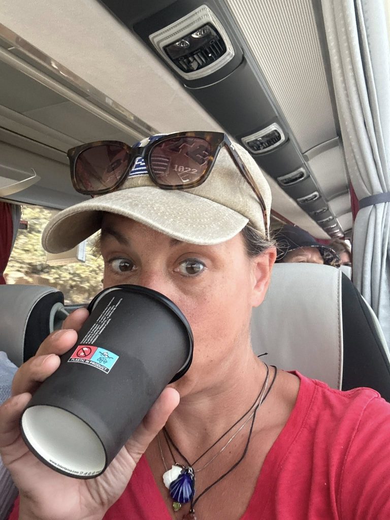 Second ouzo? Another half pint. At this point, I was sloshed. So when the bus arrived and I hadn’t finished my glass, the wonderful, clearly enabling waitress handed me a lidded takeaway coffee cup to bring my ouzo with me.