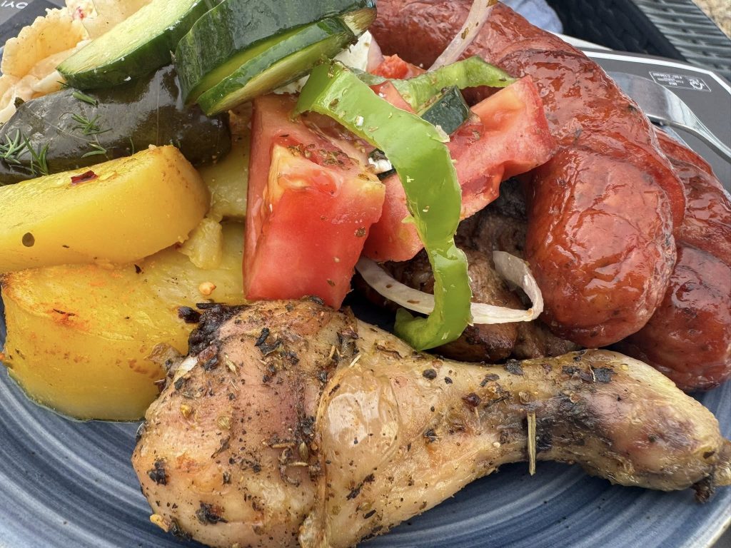 Back on the bus. Still pickled. And just in time for Amazones Village Suites**** weekly BBQ feast — which, thank Dionysus, was as decadent as it sounds. Pork steaks the size of my head, chicken legs, spicy cheese that burned so good, tzatziki I wanted to swim in, and a chocolate-hazelnut mousse that probably ended wars in a previous life.