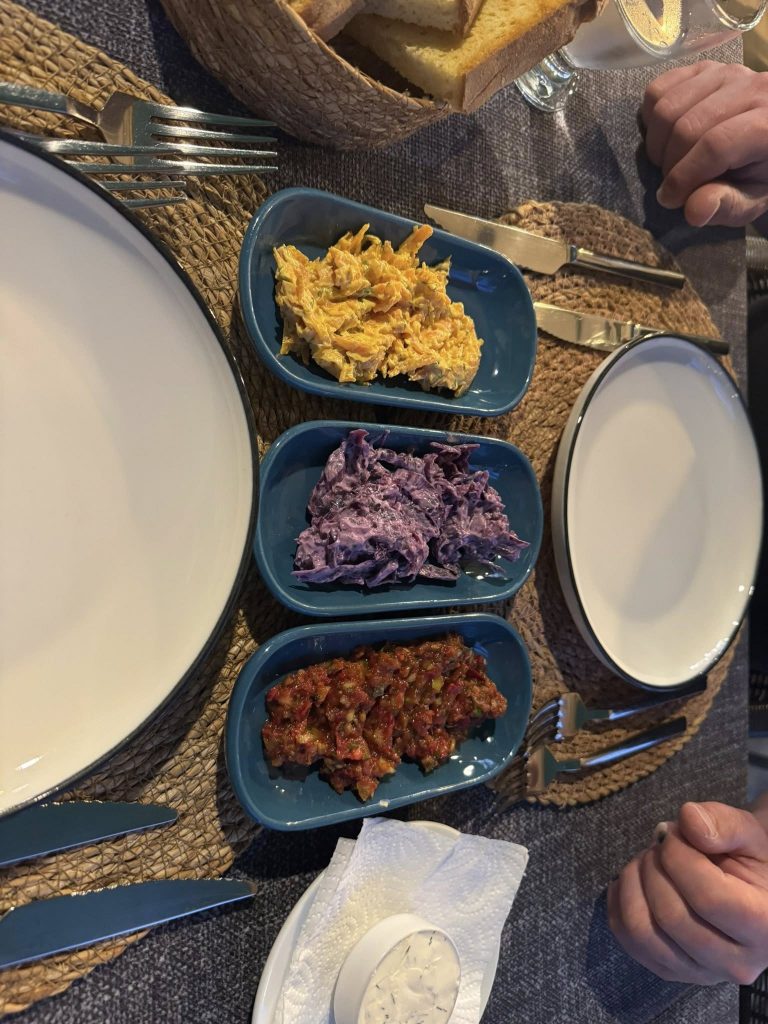 The meze arrived like a greatest hits album: carrot salad, red cabbage, spicy pepper salsa, and garlic butter that should probably be regulated by law. All of it mopped up with hot, toasted bread that didn’t stand a chance.