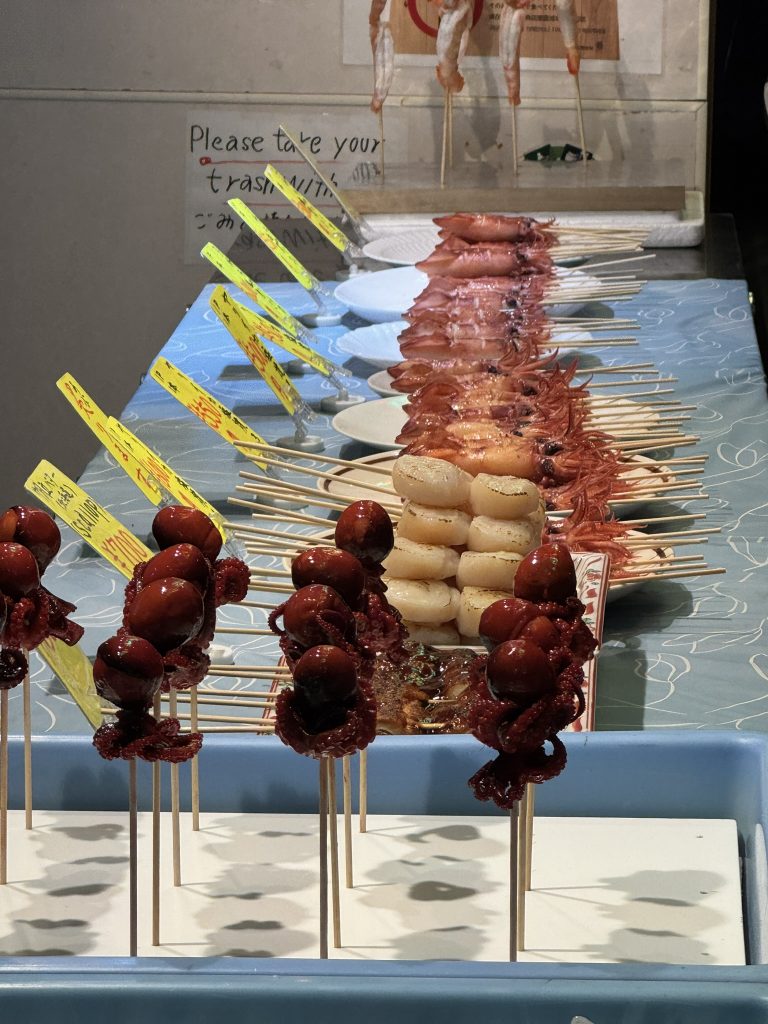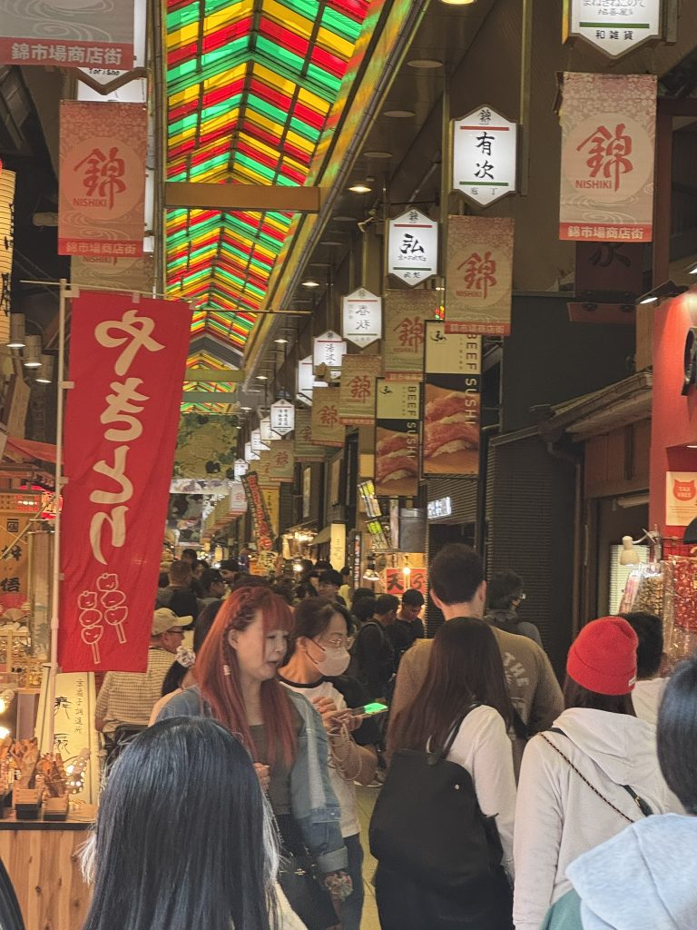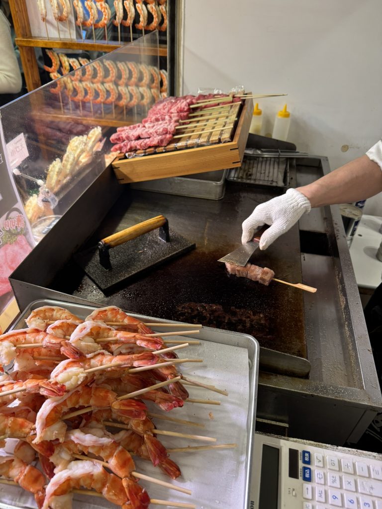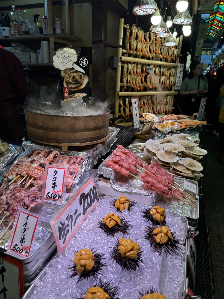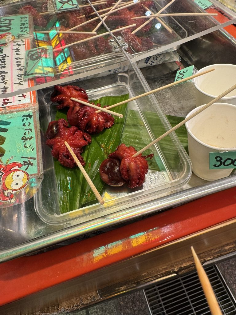 Nishiki Market 京都锦市场: Kyoto’s food paradise, and possibly where I’ll bankrupt myself. Everything — and I mean everything — is on a stick. Wagyu beef? Stick. Baby octopus? Stick. Tempura? Stick. Fruit? Stick. I am now 80% skewered street food. My wallet is crying, my stomach is cheering.