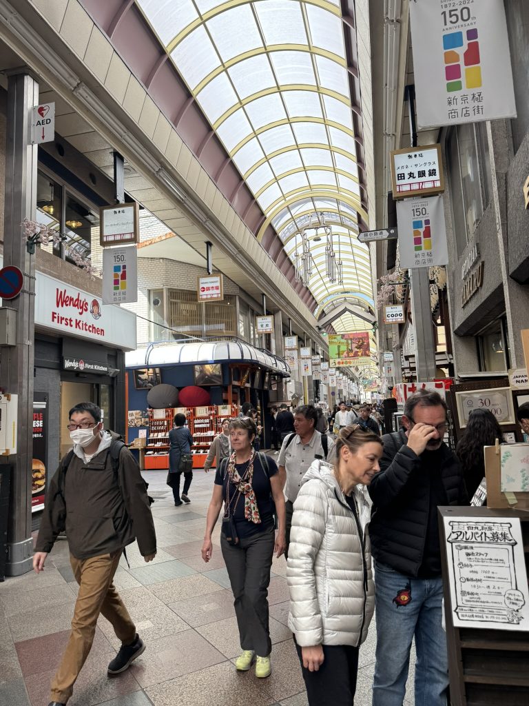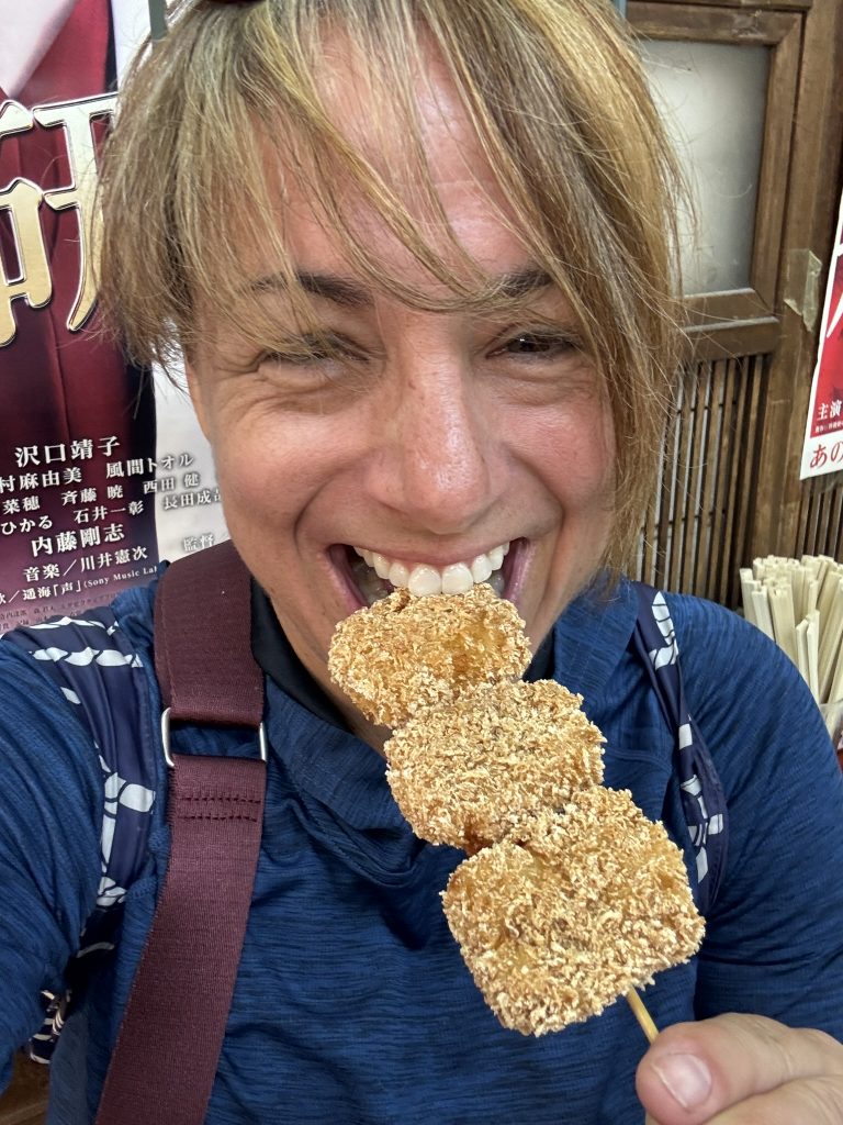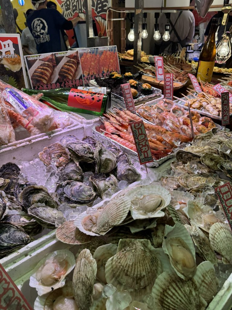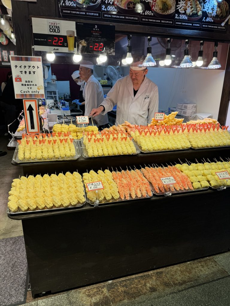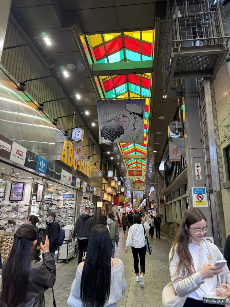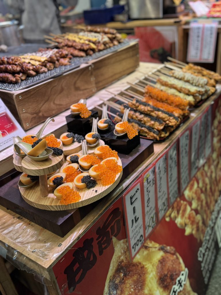 Nishiki Market 京都锦市场: Kyoto’s food paradise, and possibly where I’ll bankrupt myself. Everything — and I mean everything — is on a stick. Wagyu beef? Stick. Baby octopus? Stick. Tempura? Stick. Fruit? Stick. I am now 80% skewered street food. My wallet is crying, my stomach is cheering.