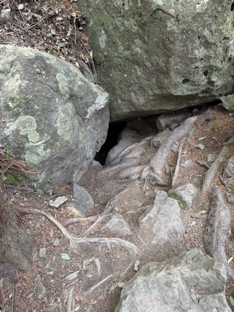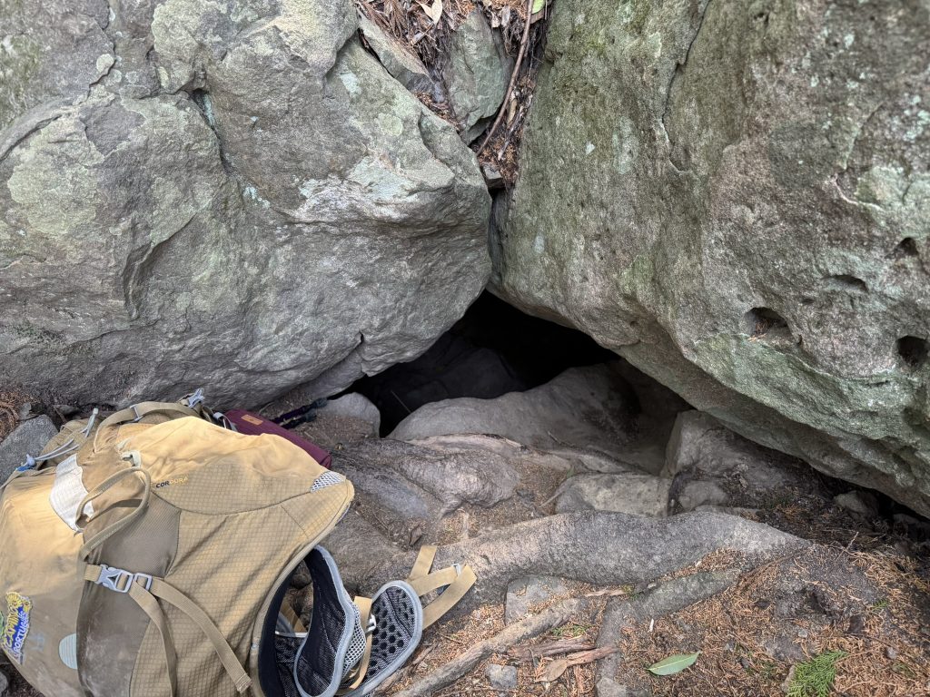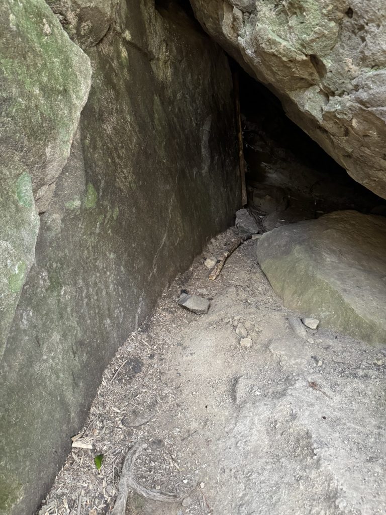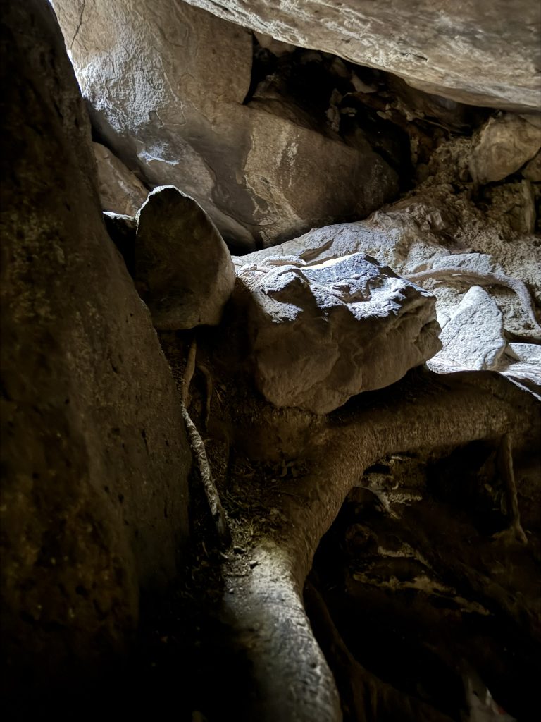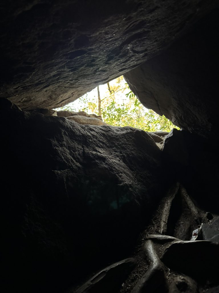 With the grace of a trapped walrus, I push harder. A jagged rock snags my hiking pants, yanking them down to my ankles as I flop out the other side like a newborn, mooning the gods and anyone unfortunate enough to be behind me (thankfully, no one was). If spiritual rebirth means emerging half-naked, sweaty, and humiliated — nailed it.