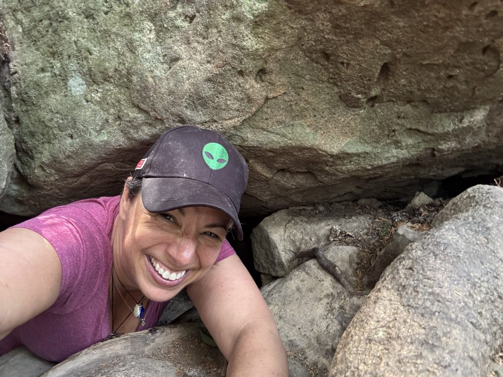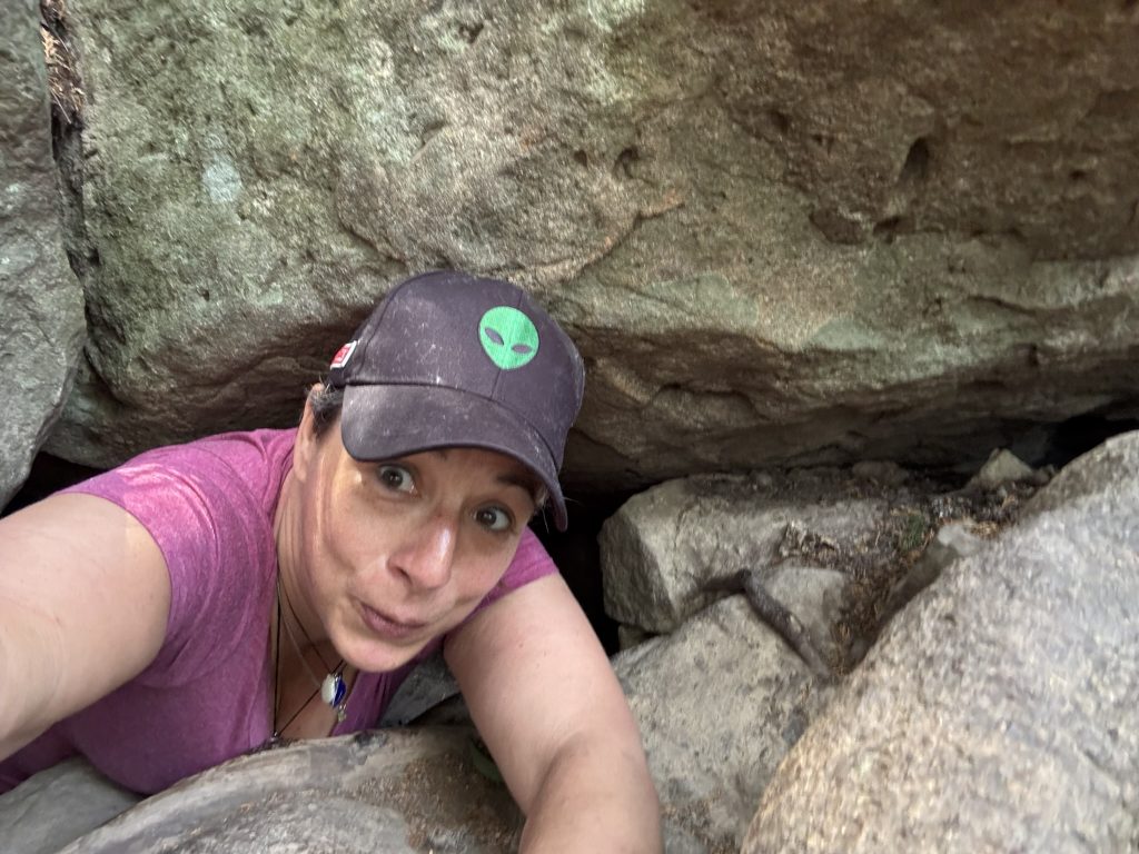 So, there I am: sweaty, armed with hiking sticks, and staring into a cave hole that looks more suited to a house cat than a full-grown human with hips and regrets. I push my backpack through first (barely fits — a bad omen), then squeeze my torso through, boobs first. Success! But then my ass gets stuck. Of course it does.