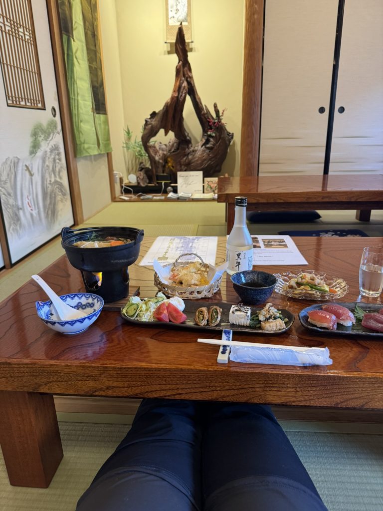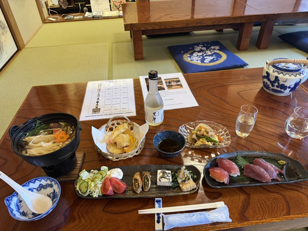 The owner’s son, a Tokyo sushi chef, designed up a feast that would make Michelin stars weep. Tuna sashimi and sushi, sukiyaki, tempura veggies, pork cabbage salad, and an entire array of tiny, beautiful bites I couldn’t even identify — paired with sake from Wakayama that went down smoother than my descent through the womb cave.