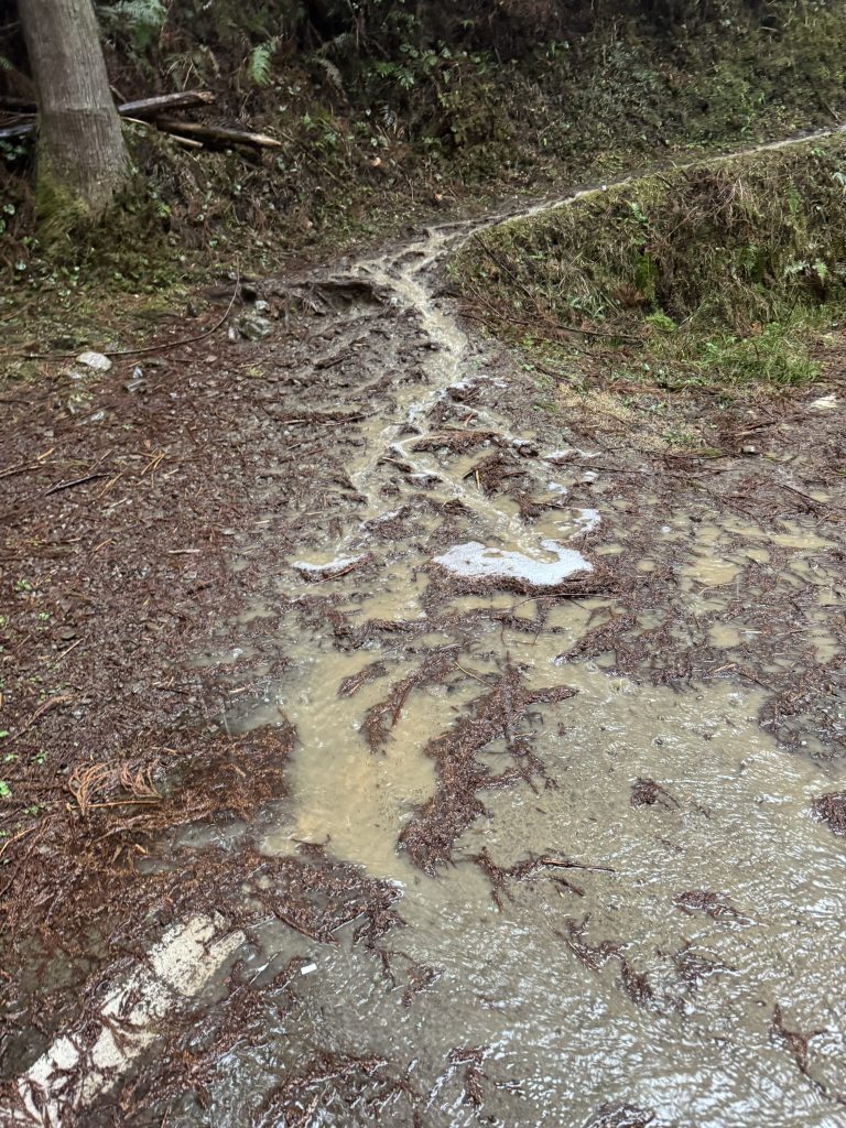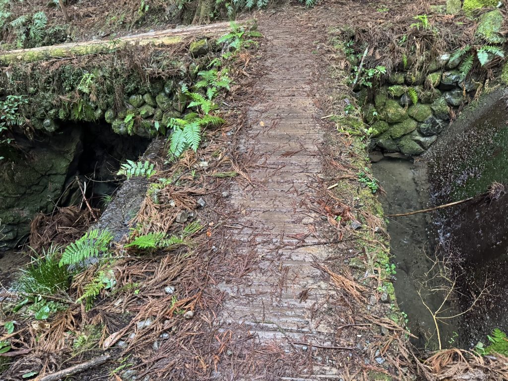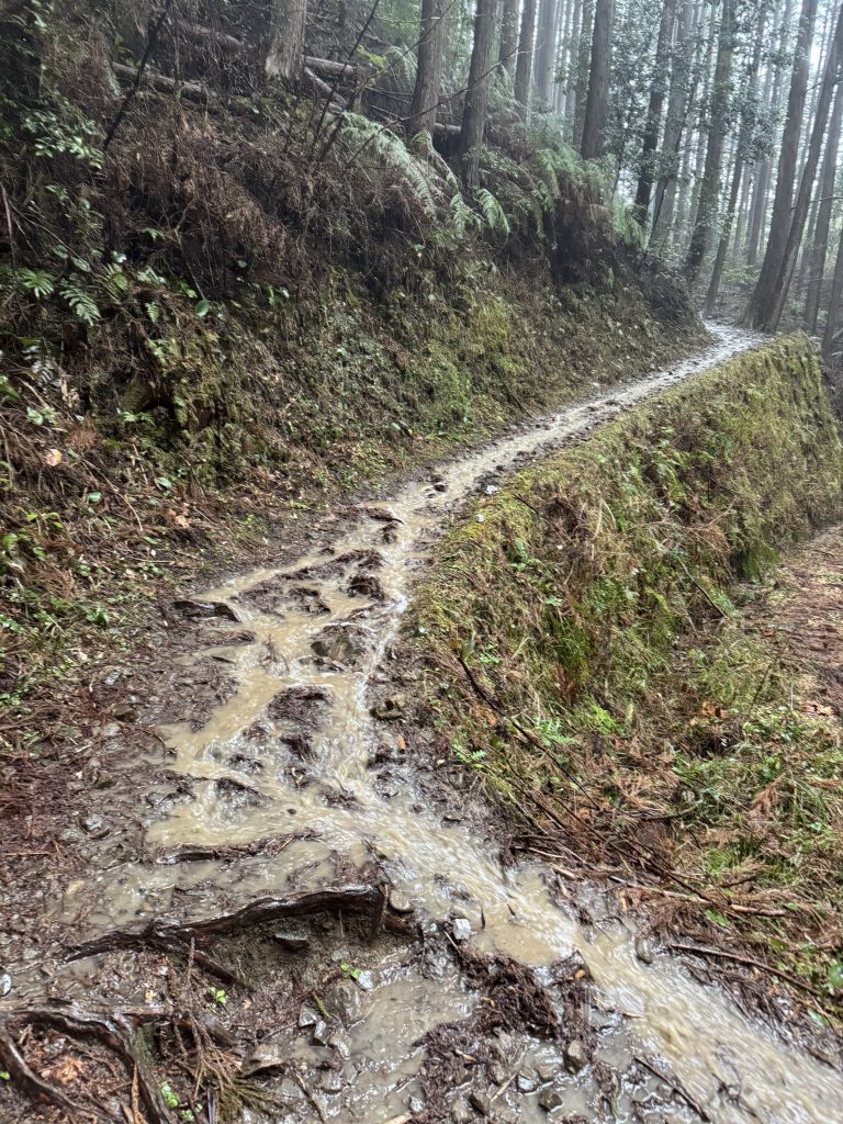 After yesterday’s shoe betrayal, I dug out my old HOKA running shoes from the depths of my backpack. Thought I had just been carrying them for no reason—turns out they were divine intervention. Like walking on air! Until I was walking through ankle-deep rivers because halfway through the day, the sky opened up and holy monsoon, Batman! It wasn’t just raining—it was biblical. The trails became flowing streams, and the tiny wooden footbridges (you know, the ones just wide enough to make you rethink your life choices) became Slip ’N Slides of death. One misstep and my fat ass would have been rafting down the mountain.