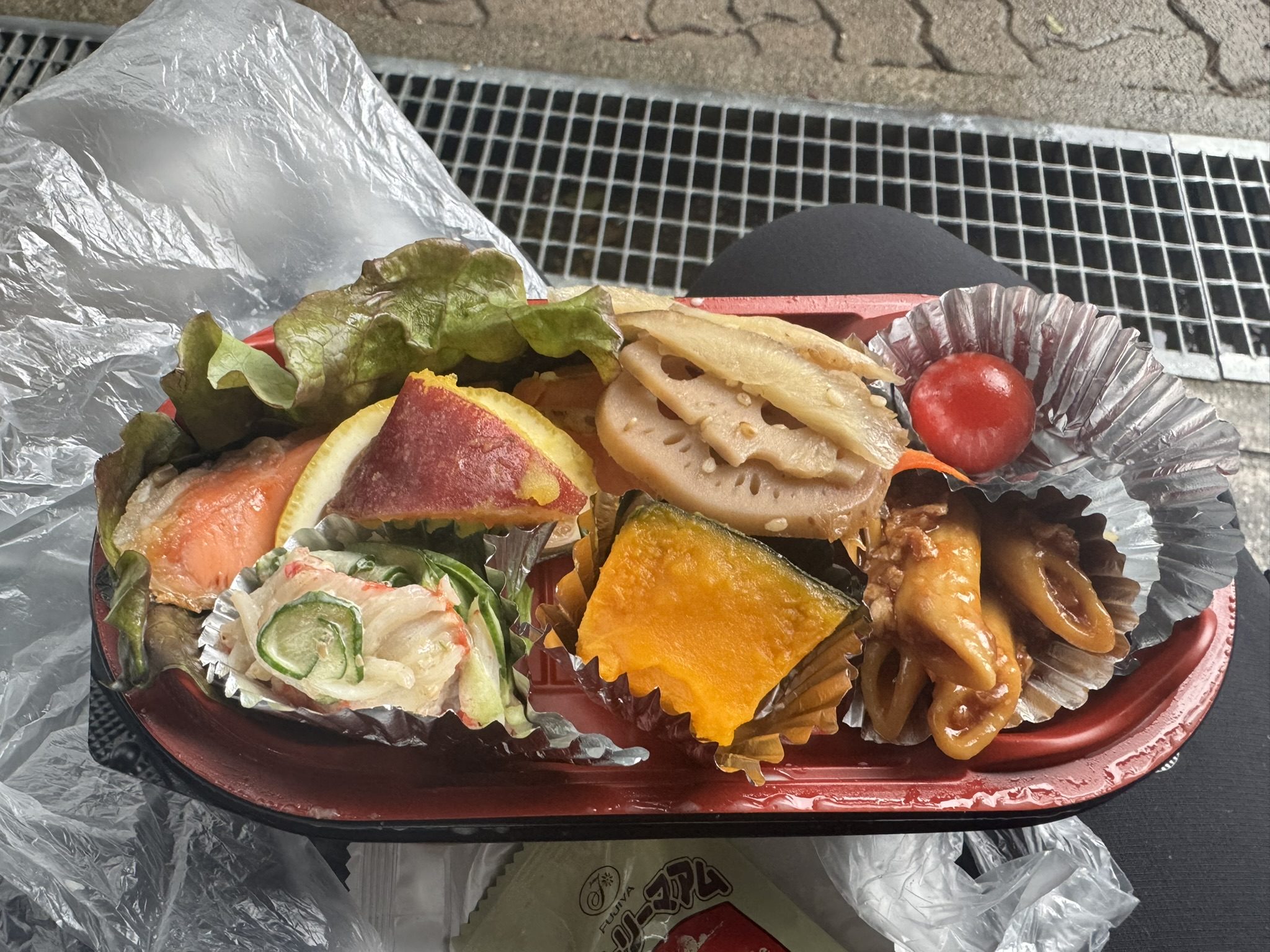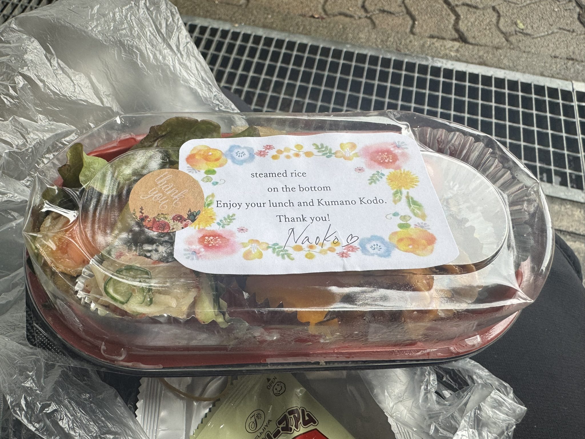 Somewhere between all the near-death experiences, there was lunch, courtesy of last night’s guest house (Guest House Kiyohime) owners—and let me tell you, they did not disappoint. Perfectly grilled salmon on a bed of steamed rice, pasta with meat sauce (random, but I’ll allow it), salad, and a damn chocolate chip cookie. Not bad for a bento eaten in the pouring rain.