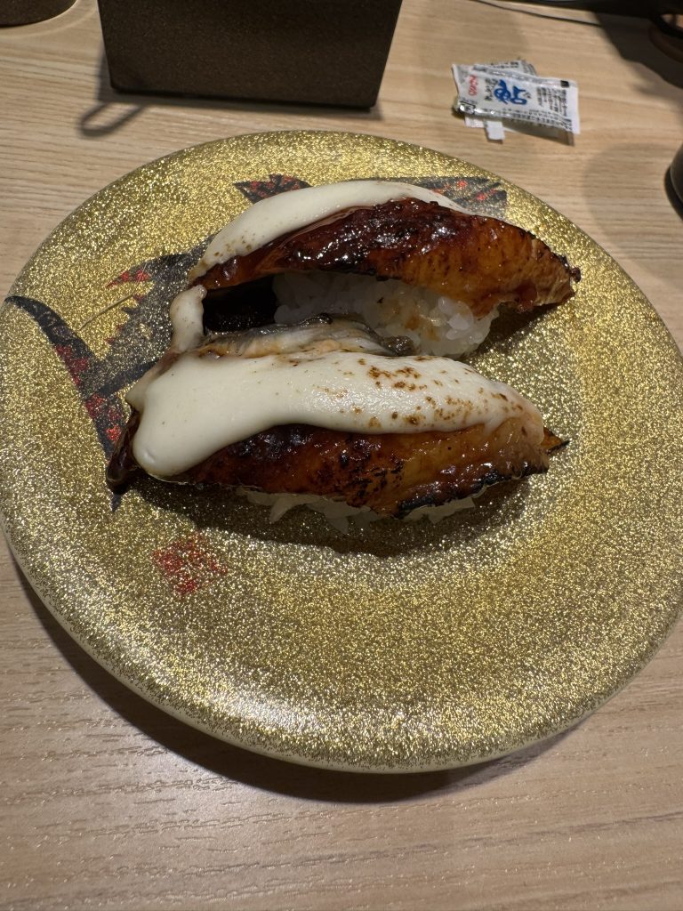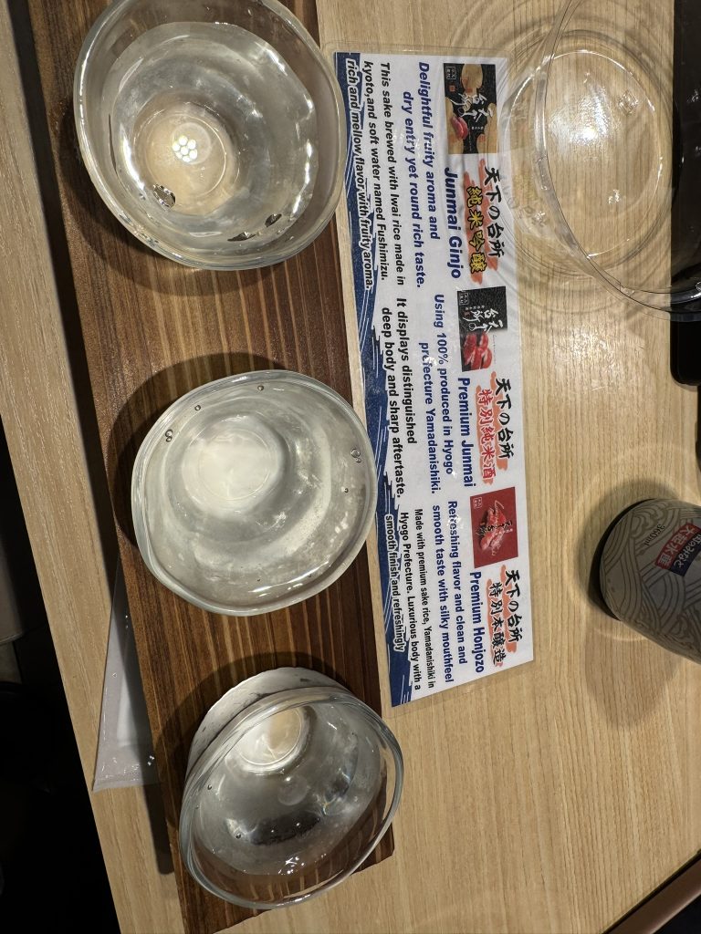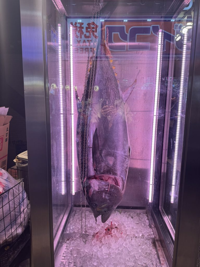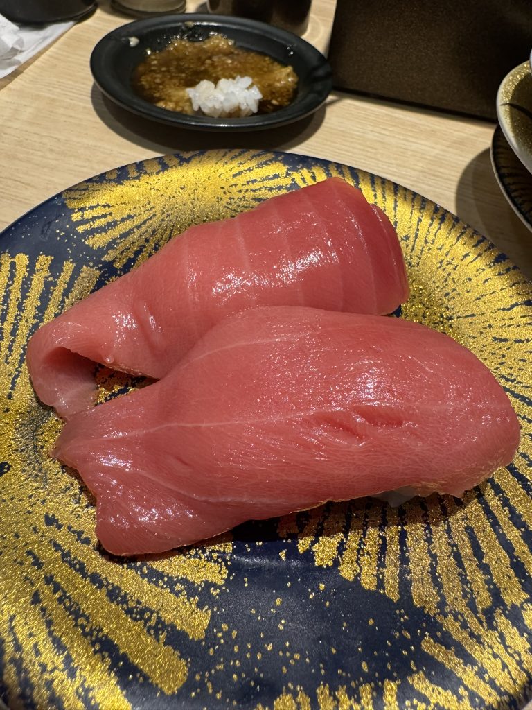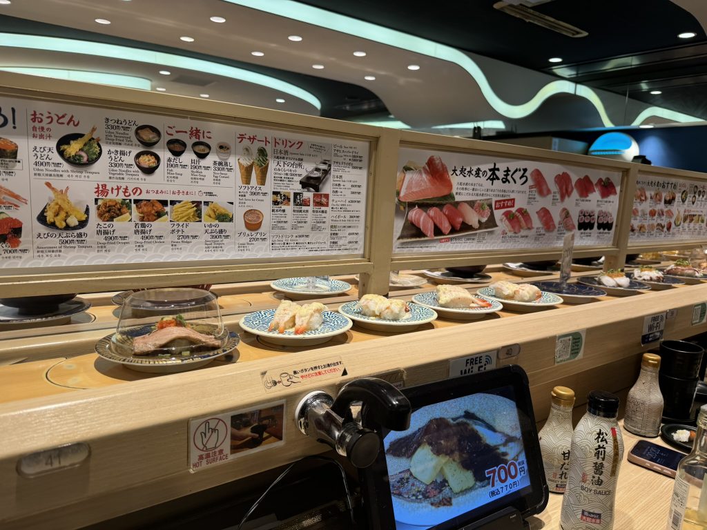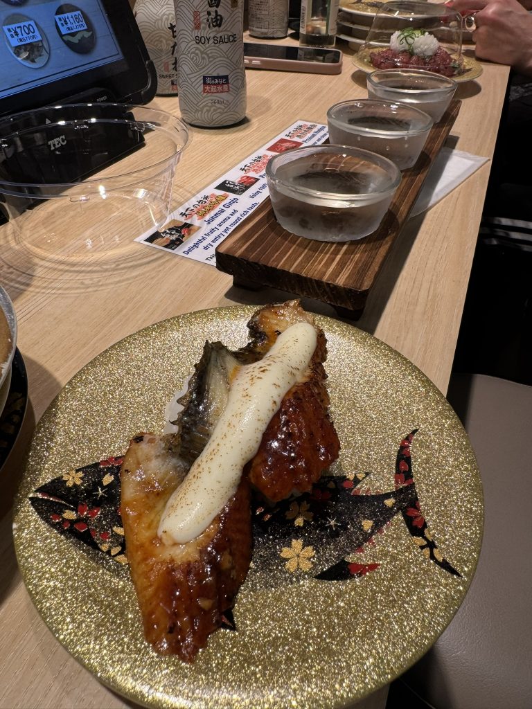 Checked into my pod hotel for a quick power nap before round two: Kaiten sushi at Daiki-Suisan Kaitenzushi Dotonbori. Conveyor belt sushi — but elevated. Fresh, delicate, melt-in-your-mouth sushi. The bluefin tuna hanging outside? I wanted to claim it like a medieval war prize. Paired it all with a lovely sake tasting set because life’s too short for bad drinks.