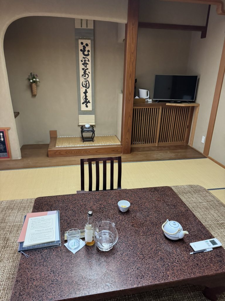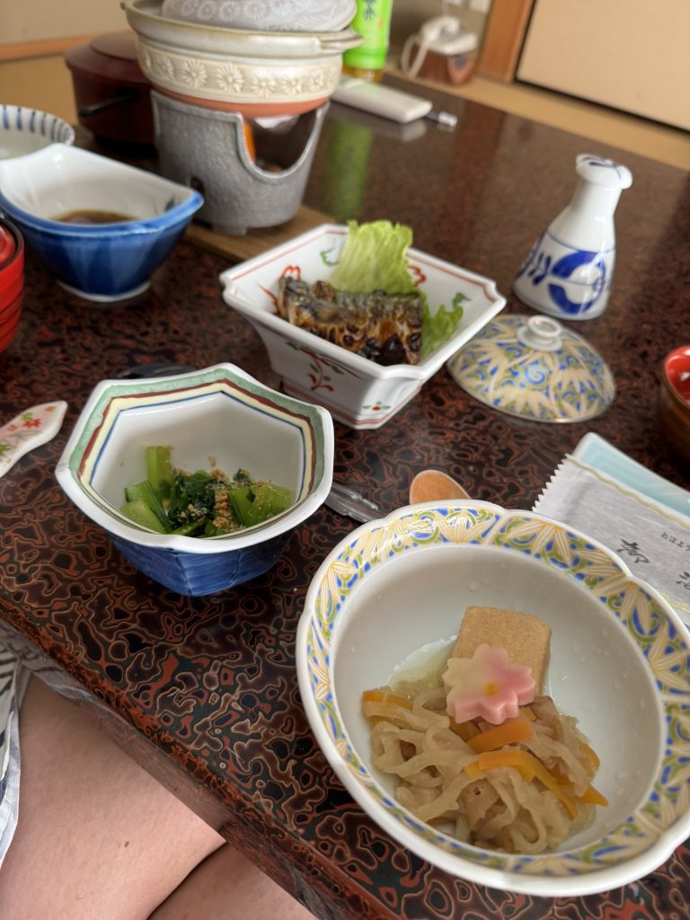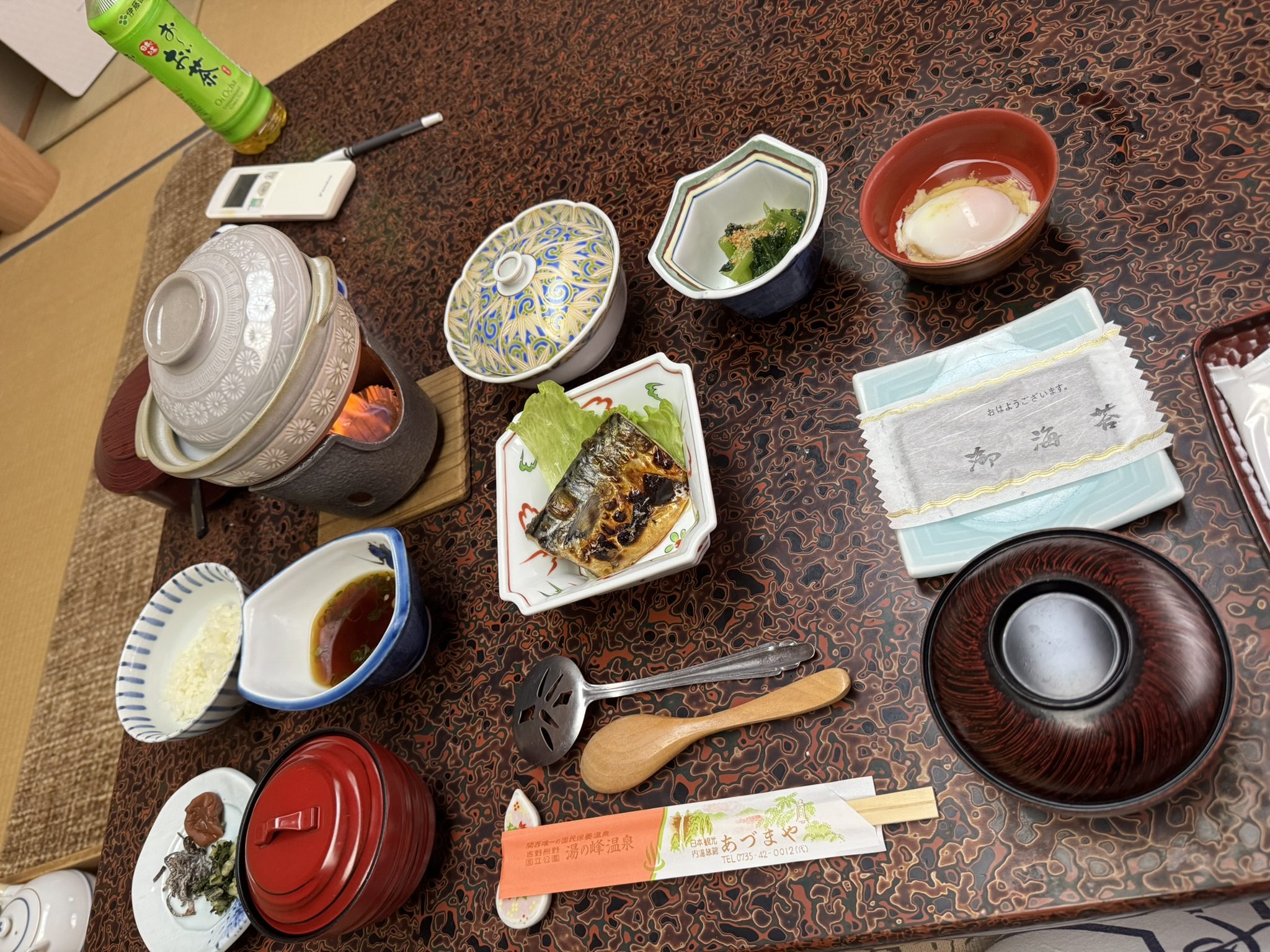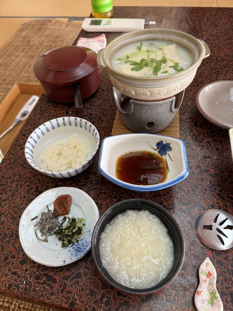 Refreshed (and now miraculously upright), I returned to my room, where my angel of a room attendant had laid out a breakfast fit for an emperor—miso soup, an egg poached in onsen water (because, why not?), mackerel, tofu hot pot, and Japanese porridge. At this point, I’m convinced Japan’s entire national identity revolves around slowly drowning you in deliciousness.