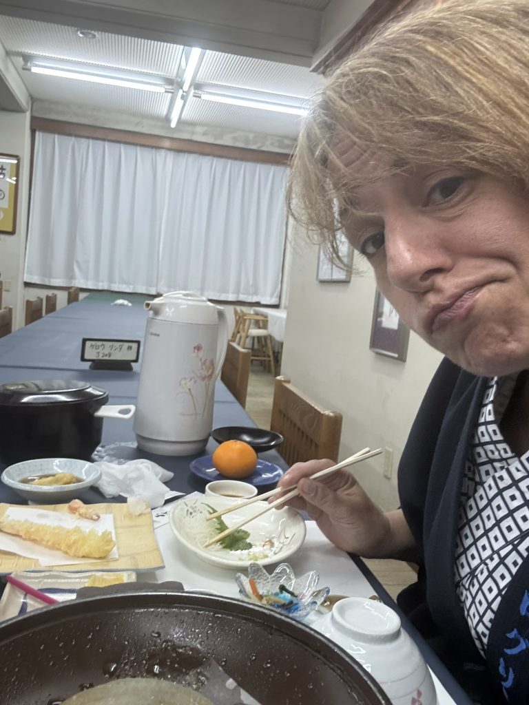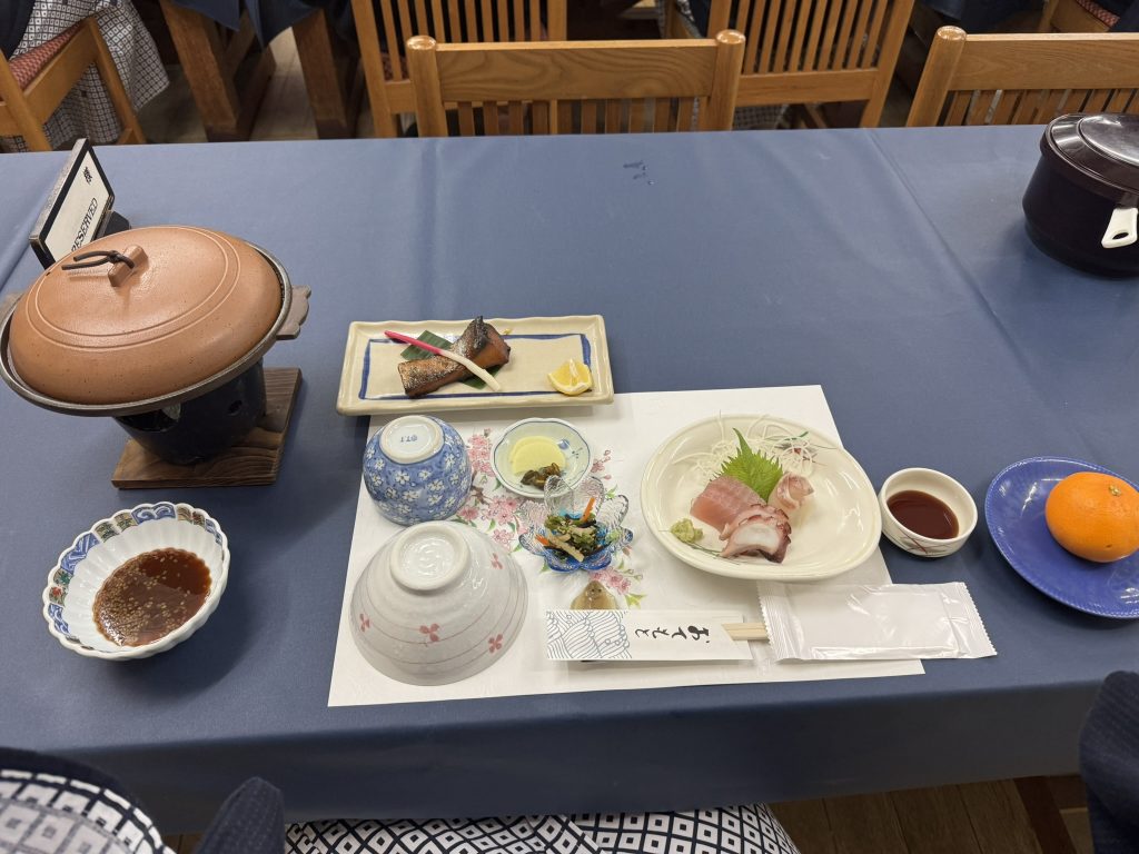 Picture this: a long, communal table, the kind where strangers become best friends over bowls of miso and mutual exhaustion. Groups of hikers, buzzing with post-trail camaraderie, deep in conversation. Laughter. Clinking chopsticks. The kind of scene where, if this were a feel-good movie, I’d get absorbed into a circle of new friends who’d invite me on an epic side quest involving sake and secret mountain shrines.